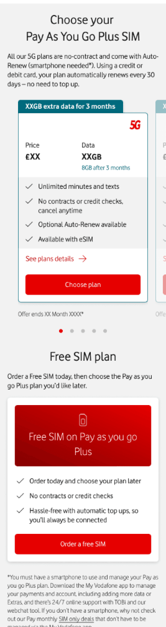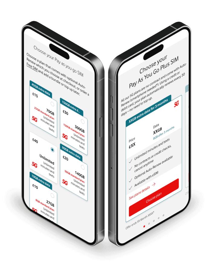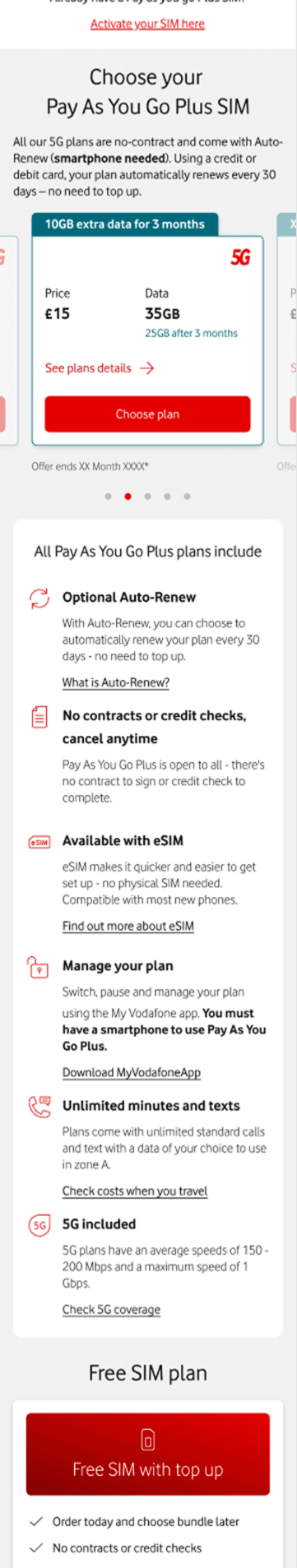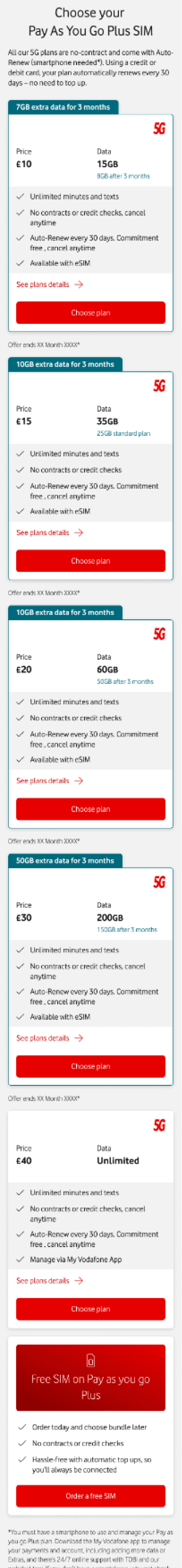 The PAYG SIMO landing page is a high-traffic acquisition point for Vodafone, where users compare mobile plans and make quick purchasing decisions.