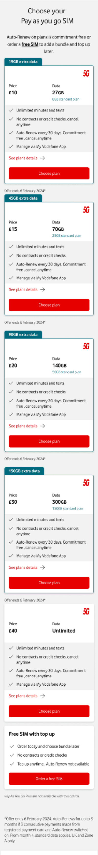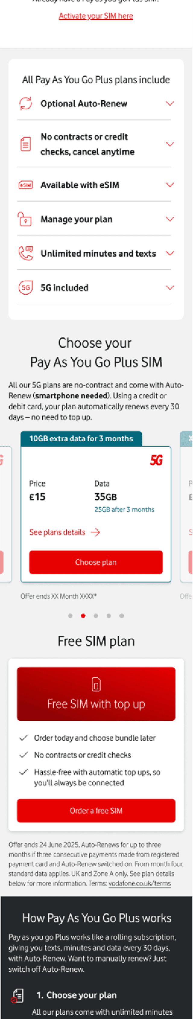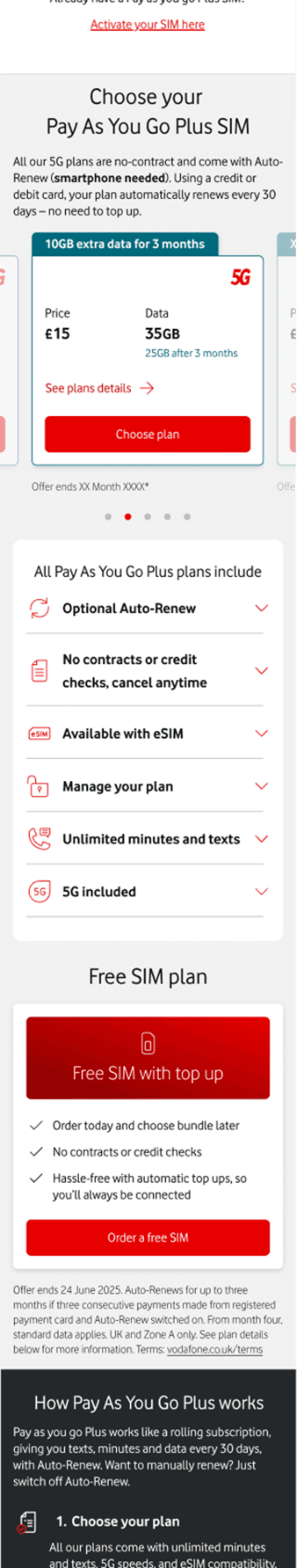 The PAYG SIMO landing page is a high-traffic acquisition point for Vodafone, where users compare mobile plans and make quick purchasing decisions.