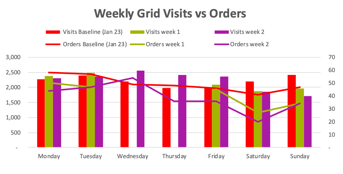 Grid → Order: flat +0.2% (funnel progression largely unchanged)