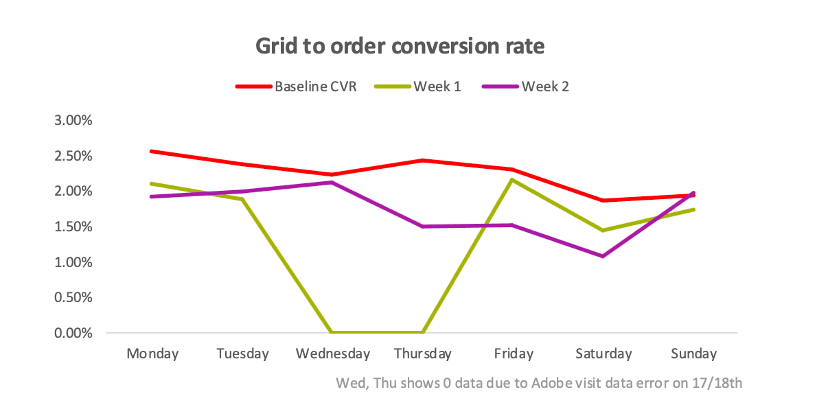 Analysis of the PAYG SIMO landing page revealed drop-off in funnel progression, particularly across the critical steps: Grid → Basket and Basket → Order. This trend was especially pronounced during the first week of testing.