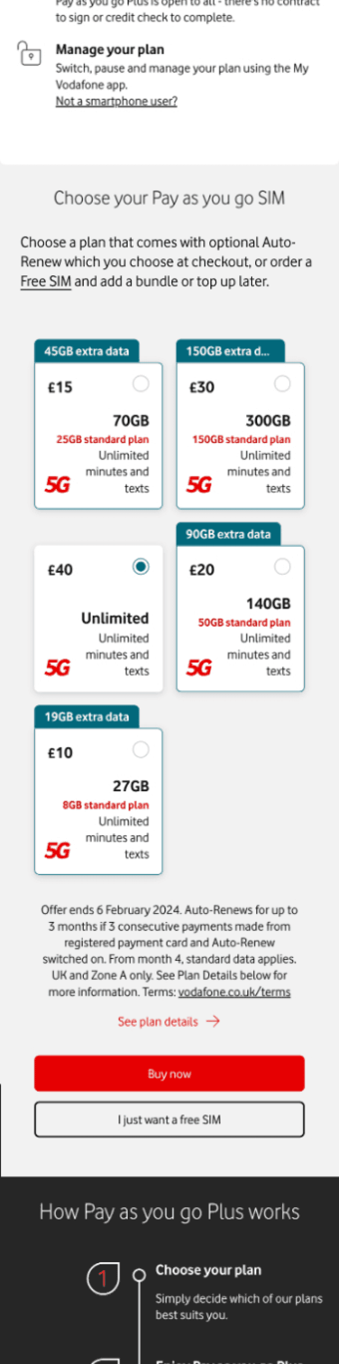 Each plan card now includes all key information (price, data, USPs, Buy Now CTA)